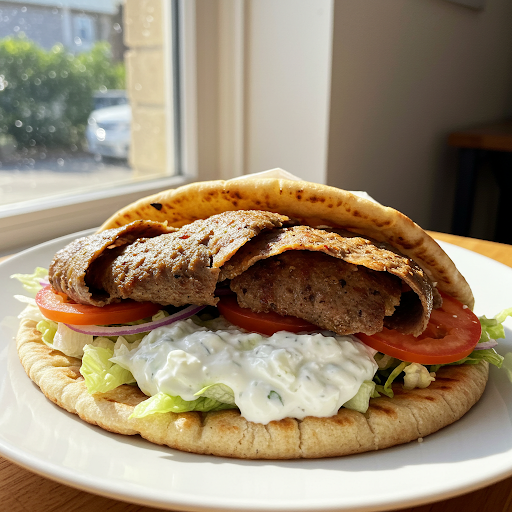 A flavorful blend of gyro meat, fresh vegetables, and creamy tzatziki sauce in warm pita bread.